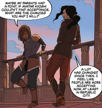 Korra and Asami spent sunset at the gazebo on Air Temple Island, and the two were approached by Kya, who, to the two girls' shock, she said the two made a lovely couple. Asami asked how she had known that the two had been a couple, and Kya replied that she recognized the signs from her first vacation with her own girlfriend. Korra told Kya she was unaware of the older woman's sexual orientation, which Kya said she kept largely private, and asked if the two had told anybody about their relationship. Korra said she told her parents, but they had been very worried about outsiders' reactions. Kya recognized this as typical Water Tribe culture, causing Korra to ask how Aang had replied to Kya coming out. Kya said Aang was very accepting, having grown up around the monks in the Air Temples. She began to describe how same-gender relationships had historically been treated across the four nations, ending with how Kyoshi, another Avatar who had loved both men and women, had been largely unable to enact much change about the perception of same-gender relationships in her lifetime. Korra worried that if Kyoshi was unable to change people's minds, she would not either, but Asami assured her that times were changing, and people in Republic City tended to be very progressive and accepting of same gender relationships. The couple's discussion with Kya was cut off when they were greeted by Mako and Bolin; Kya began to leave but told the two that if they ever needed advice, she would be there.