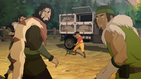 The spirit flies to the temple grounds and finds Bum-Ju, who informs Bumi of the situation. Bumi rallies the airbenders for a rescue mission and eases their concerns over not being ready. The group sets off to the valley on two flying bison and prepare for an ambush near the camp. Bumi deduces that the men who took Jinora and Kai are bison rustlers, alarming the recruits, who are reluctant to fight; Bumi reminds them that they must stick together as airbenders. In his cage, Kai manages to pick the lock and escape, but is caught by a poacher as he attempts to free Jinora and the other bison. Before he can be subdued, the airbenders appear and defeat the majority of the bison rustlers except for Ganbat; he attempts to escape on his truck with Jinora and three calves. As Kai pursues the truck, Tenzin, who is searching for Jinora on his own on Oogi, is surprised by three adult bison flying past him quickly; seeing that they are pursuing Ganbat's truck, he investigates more closely and realizes that Jinora is trapped in the cage along with the calves. Tenzin uses Oogi to ram the truck off course, and a wild bison knocks it back with an air swipe, ending the chase. Ganbat surrenders, but Kai angrily continues his own attack, throwing Ganbat around for a few moments before Tenzin stops him; he explains that airbenders do not attack defenseless foes, but compliments Kai on his technique nonetheless.