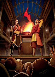 After arriving at the temple, the team was confronted by Zuko, who revealed that he wished to join their group. They initially rejected the prince, but after helping them defeat Combustion Man, Aang accepted Zuko as his firebending teacher.[21] When they discovered that Zuko had lost touch with his inner fire due to his defection, Zuko and Aang sought out the Sun Warriors to learn the original source of firebending. After undergoing a trial from the dragons Ran and Shaw, Zuko and Aang were shown a new, hopeful side to firebending, which allowed the pair to greatly improve at the art.[53] When Azula attacked the Western Air Temple following the rescue of Hakoda and Suki from the Boiling Rock, Aang and his allies were forced to flee once again.[54]