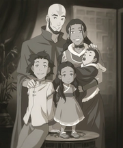 Sometime during this period, Aang married Katara, and they had three children: Bumi, a nonbender who gained the ability to airbend in 171 AG, Kya, a waterbender, and Tenzin, an airbender.[78] When Tenzin turned five, Aang began to collect a series of stories and mementos from his life for his youngest son to read following his death.[79] Despite the peace the world was experiencing, family problems plagued the Avatar. Due to Aang's second responsibility of preserving Air Nomad culture, he spent more time and traveled more extensively with Tenzin, his only airbending child, so as to instill him with Air Nomad traditions. This made the elder siblings feel somewhat distant from their father.[80] Despite this, Kya was still comfortable enough to reveal her sexual orientation to him; being completely acceptable in Air Nomad culture, Aang was supportive of her.[81] Being often stressed and feeling weighted down by his many responsibilities, Aang occasionally ventured alone to a rather isolated island where he sought out the hermitage of an ancient Air Nun, Master Wangmo. There, he could relax a bit, as Wangmo's odd-looking statue made him remember to retain his playful and fun nature.[82]