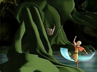 After the group got split into pairs due to a tornado hitting Appa, Aang, along with Sokka, found out that Fire Nation waste was polluting the swamp. They cleaned it up and pressed forward. Aang and Sokka found Katara in a nearby village. They were informed by a villager that a group of men from the village were trying to hunt Appa for dinner. Aang and Katara went to the location where he was last seen. They saw Appa fly into vines when a swamp monster appeared. They fought and defeated the swamp monster which turned out to be a villager. The villager educated Aang about the spirituality of the swamp and Aang saw a vision about his future earthbending master and teacher, as well as the drill headed for Ba Sing Se.