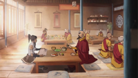 The room is simplistic, with primarily geometric shapes lining the interior and the many windows on either side of the hall. Only vegetables grown on the island are consumed by its residents, making it an all-vegetarian island.[26] This follows the ways of the Air Nomads, who were all vegetarian.[10]