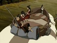 The first saddle was on Appa when Katara and Sokka rescued him, along with Aang, from the iceberg in which they had been imprisoned for one hundred years.[3] During the journey to the Northern Water Tribe and through the Earth Kingdom, many people traveled on it at one time or another. At the North Pole, the team exchanged the first saddle for the second one. Sokka and Yue used it for a flight where they saw the fleet of Fire Nation ships approaching, and it was used by Aang in the Siege of the North.[4]