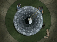 Located in center of the courtyard at the Sun Warrior city, the celestial calendar is a large orange gem that refracts slivers of light onto a calendar on the ground. This gem is part of a celestial locking system that protects a sacred room. The room can only be opened on specific days, like the summer solstice.[13] The Fire Sages also had such a calendar in the sanctuary of their temple on Crescent Island. As such, Aang was able to go to the temple on the winter solstice to speak to Avatar Roku.[2]