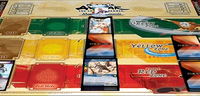 As mentioned above and visible in the first image of this subsection, the play mat has three colored zones. Each zone represents a chance for the player to put a stop to an opponent's strike card, otherwise known as an opponent's strike, and the zone's color represents the level of danger: an opponent's attack into the green zone is not extremely troublesome or unsafe for the player being attacked; an opponent's attack into the yellow zone is a bit more risky, and an attack into the red zone is very unsafe and dangerous for the player being attacked. All of this is because the green zone is each player's first line of defense, the yellow zone is the second, and the red zone is the last. If any player runs out of zones (has each zone attacked) without being able to stop any of the strikes, the opposite player scores one point.