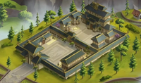 Jianzhu designed the compound in the image of a miniature city, which was split into two sections, the Avatar mansion and the training grounds.[10] A high wall ran in a perfect square around the grounds, with a division in the middle to separate the austere training grounds from the vibrant living quarters. Each section had its own imposing, south-facing gatehouse that was larger than the Yokoya meeting hall. The massive iron-studded doors of the residential gate provided access to the elaborate topiary inside[1] while barrels positioned under the gutters of the house collected rainwater during storms.[11]