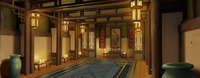 Foreign elements were carefully integrated into the design of the complex: gilded dragons chased carved polar orcas around the edges of the walls, the placement of the Earth Kingdom–style roof tiles matched Air Nomad numerology principles, and authentic dyes and paints were imported from around the world to ensure that the colors of all four nations were on full, equitable display.[1] Expensive works of calligraphy hung on the walls, and translucent vases held the day's flowers cut from the garden.[12] There was a ballroom that was similar to the one's of wealthy nobles like the Beifong family[13] There was an array of miniature trees that dotted the garden that was groomed and maintained frequently.[14]