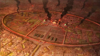 The capital city was thrown in chaos and left at the hands of a plundering horde after Zaheer assassinated Hou-Ting and Ghazan used his lavabending to bring down the outermost internal wall of the city, unifying all the rings of Ba Sing Se, much to the Lower Ring citizens' pleasure.[11] However, the ensuing chaos reduced parts of the city to ashes.[51] Currently, the citizens of Ba Sing Se are adapting to navigate without the wall between the Lower and Middle Rings. While many who lived in the Lower Ring despised the wall, many in the Middle Ring enjoyed it, because they felt that it improved their quality of life. Now the well-off are forced to mingle with the lower-class citizens. It is an unprecedented time of integration in Ba Sing Se and a hard transition.[52]
