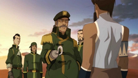 This Ba Sing Se airship captain was the leader of a four-man group of airmen tasked with prisoner transport. En route to Ba Sing Se to deliver Korra and Asami to Earth Queen Hou-Ting, his ship crashed and he had to make his way out of the Si Wong Desert with the others on a makeshift sand-sailer.[1]