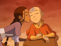 Later, when the group is flying away on Appa, Aang asks them about their current plans. They inform him that they will travel to the North Pole; he has become part of their family and they need each other. Aang returns Katara's necklace to her, saying that Zuko asked him to do so. Katara understands the joke and kisses Aang on the cheek. With that, Aang blushes and twiddles his thumbs as they fly off into the sunset.