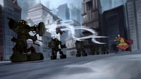 Upon reaching the individual airstrips, General Iroh hijacked an Equalist biplane that was about to take off and used it to successfully destroy the remainder of the biplane armada before it was able to reach and destroy Bumi's battleship fleet. In the process, he ejected while his damaged plane crashed into Aang's statue, causing Amon's giant mask to fall off his face. Meanwhile, Bolin and Asami faced Hiroshi Sato, who was in a mecha tank, as well as a number of other mecha tanks, back at the airfield. After a brief battle, Hiroshi was captured, and the airstrips were destroyed by Bolin's earthbending.[3]