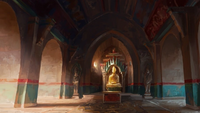 The temple is comprised of several stone pagodas, one of which enshrines a seated golden statue flanked by two guardian figures, with a number of smaller outbuildings surrounding the grounds.[9] Located directly underneath the temple is a cavern with a subterranean pool filled with spirit water that can heal grave injuries. A pulley system is used to lower individuals into the waters for spiritual healing.