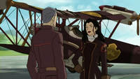 In the underground shelter, General Iroh, who had been rescued by Korra, sent a wire to Commander Bumi, warning him not to bring the second wave of reinforcements any closer to the city until the biplanes had been neutralized. Iroh, Bolin, and Asami pinpointed the location of the Equalists' airfield and decided to infiltrate the base.[1]