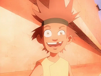 King Bumi was born in 12 BG in the city of Omashu.[3] As a child, he became close friends with Aang, showing him how to use the Omashu delivery system as "the world's greatest super slide", which caused the young airbender to label Bumi as a "mad genius".[1] The earthbender also imparted other kinds of wisdom to the Air Nomad, such as the remark "You will always remember what you never expected".[5] The two kids also used to play in the Omashu sewer system.[6] At one point, Bumi was gifted a goat gorilla pup whom he took as a pet and named Flopsie. The earthbender raised the pup with great care and love, resulting in Flopsie becoming fairly docile in adulthood.[7]
