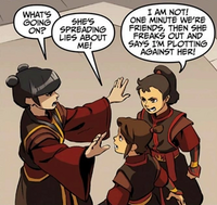Sometime after the incident with Lihua and Kiyi, Chen started to notice how Diu and Qiang were talking about her behind her back. Remembering her mother's advice, Chen immediately assumed that her two friends were plotting against her. Her distrust grew and eventually she openly challenged Diu on the school's courtyard, despite the latter's protests about the ridiculousness of her friend's accusations. This caused Chen to accuse the other girl of lying as well as cowardice. Before the conflict escalated into violence, Mai intervened and asked Chen to explain her grievances. Soon after, Headmistress Shihan also arrived at the scene, claiming that the two students could solve their issues through an Agni Kai. Chen, Diu, and several other students then silently listened as Mai and Shihan heatedly argued over whether an Agni Kai was justified in this situation. Opposing a duel, Mai eventually prevailed in the argument and ordered the students to return to their classrooms, including Chen and Diu.[1]
