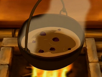 Much of the culinary traditions of the Air Nomads were lost after their civilization was nearly wiped out at the beginning of the Hundred Year War. However, it is known that the most defining characteristic of their cuisine was strict vegetarianism,[1] and they were also known for their sweets, such as fruit pies and custard tarts,[2] as many monks were skilled bakers.[3] In keeping with their traditional philosophy of non-violence and not harming the environment, the Air Nomads cultivated their own food in ways that caused the minimal environmental impact.[4] Following the Hundred Year War, Avatar Aang attempted to reconstruct some of the Air Nomad cuisine from memory as well as based on scrolls he found in the air temples. However, as the documents were often badly damaged and nearly illegible, and he had been no professional cook, he was forced to improvise.[5] Regardless, he hoped that his work would help to keep some elements of Air Nomad culture alive and to carry on the philosophies of their cooking. While many of the particular vegetables and fruits that once grew in abundance among each temple's peaks were gone, the Avatar attempted to recreate certain items with available substitutes in the Earth Kingdom and the Fire Nation. For this task, Aang requested Toph Beifong's aid to revitalize the nomads' stone ovens.[6]
