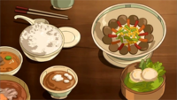 The Air Nomads' cuisine was not just about sustenance, but also about having fun with their airbending ingredients and with each other. The monks would usually prepare treats with expert airbending and teach that a tasty meal cannot be constructed with ingredients that have not been properly loved and taken care of, as cooking starts from the seed and all the way until the food ends up on the plate.[6] The Air Nomads were known to be skilled at baking[7] and steaming.[8] They are also known to not use much salt or spices in their food.[9][10] While they primarily used ingredients found at the temples, they also experimented with flavors and ingredients from across the nations, such as their sweet rice, which they could adapt to any fruits and nuts in order to prepare during their travels.[11]