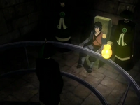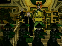 Sometime later, the Dai Li used their earthbending to open up the floor underneath a bound and gagged Mako and Bolin in order to send them toward the palace's prison. An agent later reported to the Queen that they had received a distress signal from the airship that was bringing a captured Korra toward the capital. When the Red Lotus subsequently barged into the throne room, the Dai Li attempted to stop them, but they were easily defeated, leaving the Queen at the mercy of Zaheer.[37]