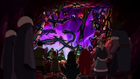 Several naturally dark spirits inhabited the Spirit World, including a dark spider spirit which trapped intruders in a thick web before tossing them into the Fog of Lost Souls.[17] However, Unalaq's increasing presence in the Spirit World caused drastic changes to the landscape and increased the number of dark spirits present in the realm. The combined negative energies of Unalaq and Vaatu allowed the former to amass an army of dark spirits to fight alongside the Northern Water Tribe military for the remainder of the Water Tribe Civil War, aiding Unalaq's forces in overpowering the Southern Water Tribe rebels and defending the Southern spirit portal.[18] During Harmonic Convergence, the horde of dark spirits also attempted to prevent Korra from defeating the Dark Avatar. They dissipated following the return of Korra's astral projection to the Tree of Time.[19]