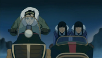 As the group moved on again, they were ambushed by dark spirits, one of which entered the snowmobile's engine, causing the machine to go haywire, sending the twins and Bolin speeding toward a mountainside. Emotionless even with the prospect of certain death, the twins grabbed Bolin and hopped off the machine before it crashed. They let Bolin slide down the slope on his own, while they used their bending to create ice shoes and skate down the mountain in perfect control, stopping with the rest of the group. When Bolin came to a halt, his snowsuit entirely inflated, Eska helped him to deflate by puncturing his coat with three ice spikes. The twins rode the rest of the way on Mako's Arctic camel, dragging Bolin, who remained seated in the now wrecked snowmobile.