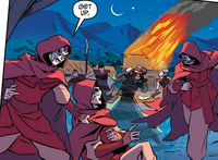 In summer 100 AG, the Domestic Forces had several encounters with Team Avatar in the weeks following the conquest of the Earth Kingdom. A group of officers discovered Aang on a western Fire Island, but mistook him for a local as the Avatar was wearing a stolen Fire Nation school uniform as disguise. They took him to a local Fire Nation school, where he was escorted to a classroom taught by Ms. Kwan. They later assisted the Headmaster when he raided Aang's secret dance party after another student told him about it. The guards tried to catch Aang, but the other students put similar headbands on to confuse them and help Aang escape.[9] Several days later, Katara saved the local village of Jang Hui from the Domestic Forces whose nearby factory was polluting the river on which the village was situated. She did this by posing as the village's spiritual guardian, the Painted Lady.[10] Later on, the authorities of Fire Fountain City attempted to apprehend Toph after she used her earthbending to scam the city's local con men and dealers. They managed to capture both Toph and Katara in an attempt to lure in Aang so that an assassin could eliminate him on behalf of Prince Zuko.[11]