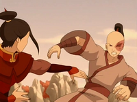 Zuko proceeded to attack the Avatar, while Katara faced the Fire Nation princess. Aang and Zuko fought evenly, though Zuko seemingly started to gain the upper hand. Azula and Katara fought viciously as well, but Azula soon found herself in Katara's bindings.