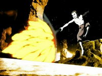 While relaxing at a lake, Aang was spotted by Fire Nation soldiers. They proceeded to send a dragon hawk to inform the Fire Lord. Combustion Man intercepted the message and later attacked Team Avatar. The members of Team Avatar failed to land a blow on him despite their efforts, so Aang ran away to give the others a chance to escape. Aang hid behind basalt columns to trick Combustion Man, but was eventually spotted and hit by a surge of combustion. He escaped Combustion Man's fatal attacks with the use of airbending and went to hide by earthbending small rocks over him. Combustion Man once more found him, but Aang escaped by quickly jumping into the air with an earth shield. He subsequently blasted himself onto Appa and flew away safely.[4]