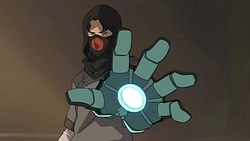 By 174 AG, Asami had streamlined the design of the electrified glove, improving upon what her father had originally created.[10] While attempting to rescue a kidnapped Prince Wu, she used her electrified glove to incapacitate an agent of Kuvira's army during a brief fight on the roof of a train.[11]