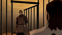 Asami and the others wake up in a prison cell. Hiroshi Sato apologizes to Asami for hurting her, but tells her that he believes she will one day come to her senses and they will be able to be a family again. Asami rejects his words and exclaims her mother would hate him for what he has become. Enraged, Hiroshi condemns his daughter and declares that he is still avenging his wife's death. At that moment, a chi-blocker informs him that the airplanes are ready for take-off. Hiroshi gives the order to annihilate the second United Forces fleet, much to Iroh and Bolin's surprise. Hiroshi goes on to goad Iroh, revealing that Equalist forces had intercepted his message to Bumi and now know exactly where the Second Division Fleet is hiding. Dismayed, Asami laments their poor chances of escape. Iroh asks Bolin if he can metalbend, which he, solely as an earthbender, is unable to do, much to Iroh's chagrin.