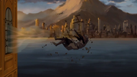 After dealing with the Lieutenant, Amon approached Mako, who was able to resist his bloodbending just enough to release a bolt of lightning at the bloodbender, sending him flying backward into a wall. Mako picked up Korra and ran back out into the hallway. Korra began to wake up, and Mako told her that everything was going to be all right. At that moment, however, Amon grabbed Mako with his bloodbending once more, and Korra fell to the ground. As Amon approached Mako in the corridor, he admitted that he was impressed with the firebender's skill, and that it was almost a shame that he had to remove his bending. Just as Amon was about to take Mako's bending, however, Korra released an airbending punch, which sent both Mako and Amon flying backward, but effectively put some distance between them. Both Korra and Amon were shocked at the revelation that Korra could airbend, and the Equalist leader tried one last time to take control of the Avatar with his bending. Korra was able to break free of his bloodbending grip, however, and she proceeded to blast him out of a nearby window into Republic City's harbor.