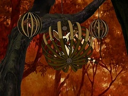 A Fire Nation trap is forged from metal and designed with a spring loaded mechanism to capture animals and people alike.[1] It is similar to the common hunting rope trick, but rather than rope, it utilizes metal springs that lock after weight is applied. Unlike other hunting traps, once activated, it hoists the trapped creature high up above the ground, making it harder to escape. The prey can only be released by unlatching and opening the trap, which is only possible from the outside. Berries and lychee nuts are commonly used as bait, and naturally found items such as twigs and leaves are used to hide the trap.[2]