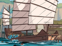 The Flying Wolfbat was used for piracy by many members of Jiang's family and she spent her childhood aboard it, sailing on the rivers of the southern Earth Kingdom. Later in her life, Jiang would also raid other ships with this vessel.[1] In 99 AG, she used the ship to travel to Hegemon's Folly at the Mo Ce Sea's coast. As the pirate leader conducted a mission further inland, the Flying Wolfbat and her crew waited at the shore.[2]