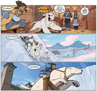 Korra corrects her mother, saying that she was not alone, as she had Naga for company, gesturing toward the pup with whom she took shelter. She explains that Naga lost her pack during the storm and remarks that she needs a new family, asking her parents if they can keep her as a pet. The two both defer to each other, but Katara takes them aside and sways them to allow Korra to keep Naga, commenting that all Avatars had animal guides in the past and that a polar bear dog may just be what a "high-energy girl" like Korra needs. As the two play around inside the house, creating a muddle, Tonraq firmly remarks that the two will tire each other out eventually, although Senna remains unconvinced. As years pass, Korra and Naga remain together, having become inseparable.