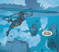 Later on the following day, the gang leader and his team sabotaged the Earthen Fire Refinery, but were promptly chased by Team Avatar. As he tried to escape, the gang leader made a wrong turn in Cranefish Town's streets and ended up on a cliff, cornered by Avatar Aang. Despite being confronted with the Avatar, he refused to surrender and attacked, but was easily incapacitated with earthbending. Although he still would not snitch about the reasons for his attack on Earthen Fire Industries, the cliff suddenly crumbled as Yaling was covertly trying to kill him and thereby ensure no loose ends. As he was falling toward the ocean, the gang leader screamed for help and was saved by Aang.[1] Grateful, he consequently told Aang that he had been hired by two girls, including one skilled earthbender, but he did not know their names or the purpose of sabotaging the Earthen Fire Refinery.[2]