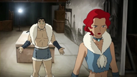 When Asami and Bolin entered Varrick's yacht, Ginger was casually lying on a couch, watching how Varrick was under the impression that he was levitating. As opposed to all the others in the room, she did not participate in the feigned enthusiasm over his supposed achievement of levitating a foot off the ground. She showed no interest in her surroundings. However, when Varrick showed Asami and Bolin a moving picture depicting an ostrich horse and elaborated on his plans to make the "movers" something big, she immediately answered his call for a demonstration. She sensually strolled to the middle of the room and struck several poses, much to the enjoyment of both Varrick and Bolin. After she was praised for her action, she was told by Varrick to go rest her legs, as they were a big part of his future plans. She later accompanied Varrick to the feast in honor of Chief Unalaq.[3]