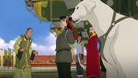 Gun escorted Korra to the palace once more following her retrieval of the tax shipment and attempted to lead her out after she refused to leave Ba Sing Se, only to be knocked down again.[1]