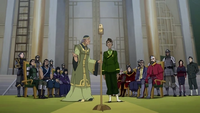 Although Hou-Ting's regime had ended, Gun remained a part of the royal cabinet and in 174 AG, he traveled with two other members of the cabinet to Republic City to anoint Prince Wu, Hou-Ting's great-nephew, as the new Earth King. He only managed to make it to the United Republic of Nations capital ten minutes before the start of the coronation, where he informed the prince that the royal servants had scattered across the kingdom and most of the artifacts, including the crown, had been looted. The only royal jewel Gun had managed to bring with him was a golden earring and implored the royal to look at it as a brooch. As he tried to pin it on Wu's jacket, the prince pushed Gun away and stormed off. Nonetheless, the ceremony proceeded and after Gun pinned the brooch on Wu's chest, he declared him king of all the earth lands and glorious defender of Ba Sing Se.[3]