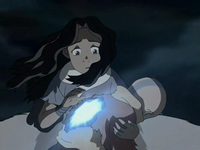 After Avatar Aang ignored Jeong Jeong's warnings about using firebending without proper training, he accidentally burned Katara due to a lack of control over his flames. Seeking to soothe the pain, Katara submerged her hands in a creek, only to see the water around her hands glow silvery-blue and heal her; Jeong Jeong subsequently explained to Katara the healing abilities sometimes possessed by waterbenders. Having accidentally discovered this new ability, Katara used it again later that day to heal a burn on Aang's forearm, after his fight with Admiral Zhao.[1] Upon reaching the Northern Water Tribe, Katara attended beginner healing classes with Yagoda, but primarily wanted to learn combative waterbending.[3]