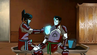 As Korra's waterbending teacher, Katara also passed the art of healing onto Korra, and she used it to heal Bolin's shoulder after it was injured in the third round of the Fire Ferrets' semifinal match in the Pro-bending Tournament.[19] She used the technique once more when she healed General Iroh's injury he sustained during the Equalists' attack on Republic City.[20] When Korra had her bending severed by Amon, she sought out Katara in order to be healed by her, but she was unable to restore the Avatar's bending.[16]