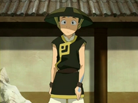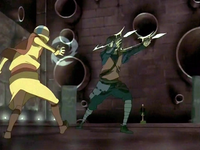 After the Bandit effortlessly defeated The Boulder, the host of the tournament, Xin Fu, offered a large sum of gold to whoever could defeat the Blind Bandit in a fight. Seeing an opportunity to talk to the Bandit, Aang challenged her. The Bandit, however, was ready for a fight and refused to engage in conversation, instead launching a boulder at Aang. She was not prepared, however, to face an airbender and was defeated when Aang blew her out of the ring. The Bandit took badly to her loss and stormed off, refusing to listen to Aang when he beckoned to her.