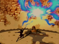 Aang's ultimately wound up in an abandoned town where he was later found and confronted by Azula. Zuko arrived on scene shortly after and all three assumed fighting stances, prepared to duel. Azula fired the first shot, hitting Zuko hard and knocking him back. All three exchanged blows until the duel was joined by Katara, Sokka, Iroh, and Toph. Azula was eventually cornered by the other six combatants. She surrendered and Iroh momentarily let his guard down, turning to see his comrades. Azula took advantage of this and launched a fire blast at him, striking him in the chest. Zuko let out a horrified cry, and all four benders unleashed their power against her; Azula, however, was able to escape the scene unharmed. Aang, Katara, Sokka, and Toph gathered around Iroh, but Zuko yelled for them to leave, backing up his words with a sweeping arc of flame. Respecting his need for privacy, Aang and the others fled.[7]