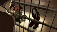 After escaping the factory, Asami, along with Mako and Bolin, moved to Air Temple Island, where they were greeted by Korra, Ikki, Jinora, and Meelo. Asami was told by Meelo that she was beautiful and was asked for a lock of her hair. Korra and Ikki showed Asami her room on the island, where Asami was told by the airbender that Korra also liked Mako. Asami reacted with mild confusion and discomfort, stating that she was not really aware of that, but decided not to act on it. An embarrassed Korra quickly led her to her room and slammed the door on Ikki, leaving the two teenagers by themselves. When Korra apologized for the rustic nature of the abode, Asami quickly put the Avatar at ease by stating that the room was charming and did not remind her of her father, which were all good things in her opinion. Later, when Team Avatar decided to patrol the city, she offered her Satomobile as a method of transport for the team when Naga refused to carry the group. Armed with the electrified glove her father had given her, she drove the car through the streets. Using a police monitor that her father installed, they soon found, chased, and captured several Equalists, much to Tarrlok's dismay. As they continued patrolling the next night, Asami observed Mako and Korra's interaction in the backseat of her Satomobile with suspicion. When Asami and the team arrived at the Dragon Flats borough and saw a group of nonbenders being arrested, Tarrlok ordered to arrest Asami too as she was a nonbender and the daughter of an Equalist. At Mako's attempt to stop the police, she was taken to prison along with her boyfriend and Bolin.[6]