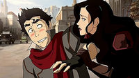 After discovering that the Equalists did not take Korra and that Tarrlok was behind Korra's disappearance, she returned with the others to City Hall to expose him. However, Tarrlok escaped after he incapacitated Asami and everyone else with his bloodbending. The group was able to locate the Avatar later that evening when they found Naga howling while roaming the streets, carrying a weakened Korra. Although Asami was glad to have found Korra without major injuries, she was crestfallen seeing how concerned and caring Mako was with Korra, when Mako pushed the group overcrowding Korra out of the way and carried the Avatar in his arms. Asami looked on with sadness and pain-filled eyes as Mako set Korra down on Oogi and gently brushed her hair from her face.[7]