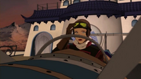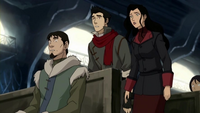 Asami piloted Varrick's biplane to take Korra close enough to the Northern Navy's blockade in order for her to clear them out. From their elevated position, it was easy to spot the ship that was transporting the prisoners to the North. Asami directed the aircraft after the ship and she jumped out of it together with Mako and Korra right before she let it crash on the surface. The plane's explosion served as a welcomed distraction for the threesome to sneak on board and take out the guards, freeing the prisoners. As the freed men made their way back to the mainland, Asami and her friends set course for Republic City, intending to persuade President Raiko to deploy the United Forces in order to save the Southern Water Tribe from a northern attack.[2]