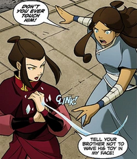 The following day, Katara voiced her still present concerns about the princess' presence on the trip, though she took confidence in the knowledge that if Azula did try something, there would be four of them to take her down. When Azula subsequently zapped Sokka with her lightning, Katara was quick to trap the princess' hand in ice with her waterbending to prevent any further action. As the tension subsided, she released her, withdrawing the water into her pouch, though she warned Azula to never touch her brother again, albeit to little effect.