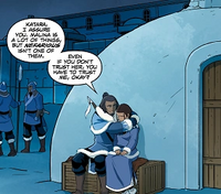 Katara, having arrived, looked on at the bridge with worry. Noticing her concern, Aang walked over to her and comforted her by kissing her on the cheek, assuring her that Sokka's plan would work out. Sokka then walked up to her and asked if she was alright. Katara expressed her concern that her trip home had not turned out to be anything like she had expected it to be; she had thought that now that the war was over their lives could go back to how they had once been. Sokka comforted Katara, saying that while he understood her, it was impossible for anything to be as idealistic as she had imagined because the war altered the tribe, even reaching back to Kanna's time. After Gilak had arrived, the chi-blockers crossed the bridge and chi-blocked all of Team Avatar. Unbeknownst to their attackers, the team had been wearing chainmail armor, which thwarted the chi-blocking from taking effect, and awaited the opportune moment to strike back. When Gilak attempted to cut the ropes of the bridge, Katara and the others engaged their attackers, though they were unable to save Hakoda, Malina, and Gilak before the latter collapsed the bridge entirely. While Aang had managed to grab hold of the three adults and prevent them from falling to their deaths, Katara fashioned an ice ladder to get to them. When Katara saw Malina sacrifice herself to save Hakoda, letting herself fall into the abyss, Katara rushed to her aid on an ice slide. Although they both crashed against the wall of the abyss, they managed to get out of there safely.
