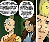 When Aang and Katara went to the Earth Kingdom Royal Palace and met Kuei, they told him the news. At the king's final decision of sending troops to attack Yu Dao to solve the conflict, the couple showed their surprise and disagreement, however, they were not able to change the sovereign's mind. Realizing that sending in the army would be seen as a declaration of war, Aang and Katara hurried back toward Yu Dao in an attempt to persuade as many of the Fire Nation colonials there to evacuate.[2]