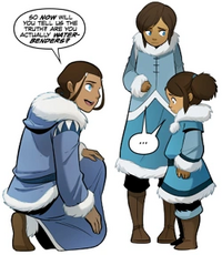 They found out, however, that a town with a large refinery had been built on the previously sacred grounds. Walking around through town, Katara tried to console Aang, pointing out that a lot can change in a hundred years. Her attention was drawn away, however, when Niyok, a girl from the Southern Water Tribe whom she had not seen since leaving there, called out to her and happily greeted her. Upon asking what she was doing there, Katara was directed toward the Earthen Fire Refinery where the girl was working with her sister. Realizing that Nutha was there as well, Katara merrily called out to her fellow tribeswoman, though received a noncommittal stare back, prompting her to leave the sisters alone.