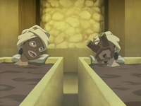 Later, Aang and the others returned to Master Yu's Earthbending Academy to try to discover where the Blind Bandit lived. Questioning the same boys Katara "asked" about the tournament, who were now quite intimidated by her, they did not receive much information, until Aang remembered the flying boar he also saw with the girl in his vision. The boys told them the flying boar was the symbol of the Beifong family, the wealthiest family in the town.[7]