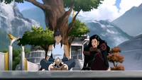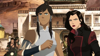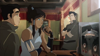 Korra and Asami made their way to a tavern, where they found Tonraq, Lin, and Lord Zuko. She embraced her father and was reintroduced to the former Fire Lord, whom she was glad to see. She also apologized to Lin for ditching her back at Zaofu and asked how they found them, to which she was sarcastically reminded by Lin that she was a detective. The girls were also informed about Mako and Bolin's capture and Tonraq asked them if they knew what happened to the Earth Queen. After hearing a radio report that the queen had been overthrown and Ba Sing Se was in chaos, the Avatar realized it was the Red Lotus' doing, informing her unsure father that it was the group who was after her, while ominously warning their actions against the monarch were only the beginning.[11]